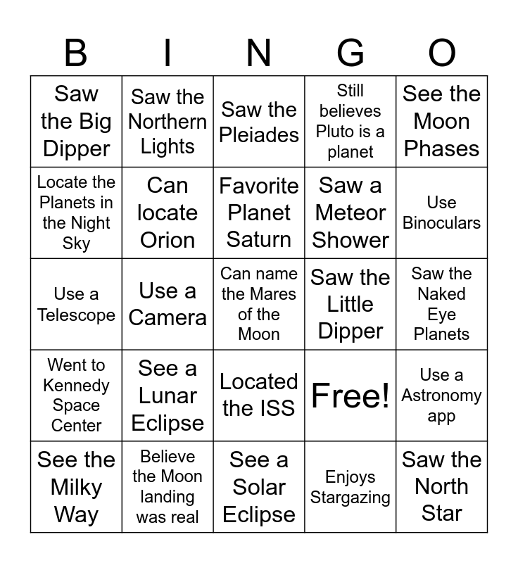 This bingo card has 25 words: See a Lunar Eclipse, See a Solar Eclipse, Favorite Planet Saturn, See the Milky Way, See the Moon Phases, Saw the Big Dipper, Locate the Planets in the Night Sky, Saw the Northern Lights, Saw the Little Dipper, Located the ISS, Saw a Meteor Shower, Use a Telescope, Free!, Use a Astronomy app, Can locate Orion, Saw the North Star, Saw the Naked Eye Planets, Saw the Pleiades, Use Binoculars, Use a Camera, Can name the Mares of the Moon, Believe the Moon landing was real, Went to Kennedy Space Center, Still believes Pluto is a planet and Enjoys Stargazing.
