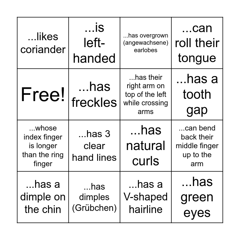 This bingo card has 16 words: ...has dimples (Grübchen), ...can bend back their middle finger up to the arm, ...has overgrown (angewachsene) earlobes, ...likes coriander, ...whose index finger is longer than the ring finger, ...is left-handed, ...has natural curls, ...has a V-shaped hairline, Free!, ...has freckles, ...has a dimple on the chin, ...can roll their tongue, ...has 3 clear hand lines, ...has a tooth gap, ...has their right arm on top of the left while crossing arms and ...has green eyes.