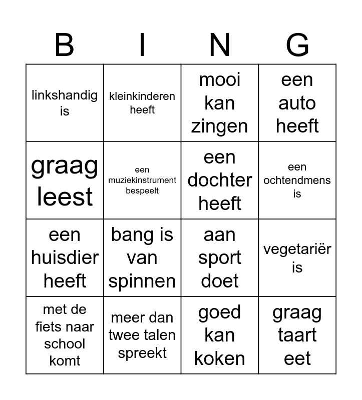 This bingo card has 16 words: meer dan twee talen spreekt, vegetariër is, mooi kan zingen, linkshandig is, een huisdier heeft, kleinkinderen heeft, aan sport doet, goed kan koken, graag leest, een muziekinstrument bespeelt, met de fiets naar school komt, een auto heeft, bang is van spinnen, een ochtendmens is, een dochter heeft and graag taart eet.
