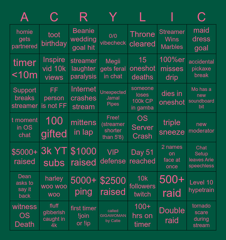 This bingo card has a free space and 49 words: 500+ raid, 100%er misses drip, 100+ hrs on timer, 100 gifted, Internet crashes stream, new moderator, toot birthday, first timer !join or !ip, Streamer Wins Marbles, VIP defense, maid dress goal, 0/0 vibecheck, dies in oneshot, someone loses 100k CP in gamba, harley woo woo woo, triple sneeze, timer <10m, accidental pickaxe break, Level 10 hypetrain, Throne cleared, 15 oneshot deaths, mittens in lap, homie gets partnered, Inspire vid 10k views, witness OS Death, streamer laughter paralysis, Mo has a new soundboard bit, fluff gibberish caught in 4k, Unexpected Jamal Pipes, FF person is not FF, Xan or Catie die in OS, OS Server Crash, Dean asks to say it back, 5000+ ping, t moment in OS chat, Day 51 reached, 2 names on face at once, Chat Setup leaves Arie speechless, Support breaks streamer, $1000 raised, $2500 raised, $5000+ raised, tornado scare during stream, called GIGAWOMAN by Catie, Megii gets feral in chat, Beanie wedding goal hit, 10k followers twitch, 3k YT subs and Double raid.