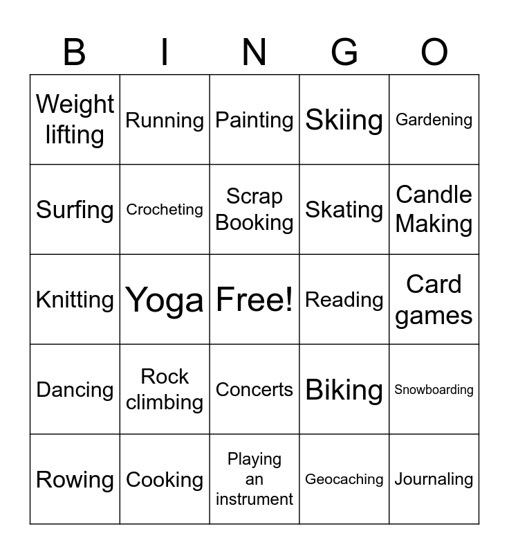 This bingo card has a free space and 30 words: Cooking, Baking, Yoga, Hiking, Weight lifting, Painting, Crocheting, Concerts, Reading, Playing an instrument, Card games, Journaling, Geocaching, Karaoke, Candle Making, Escape room, Biking, Dancing, Rock climbing, Gardening, Knitting, Pottery, Running, Skating, Surfing, Skiing, Snowboarding, Rowing, Scrap Booking and Jewelry making.