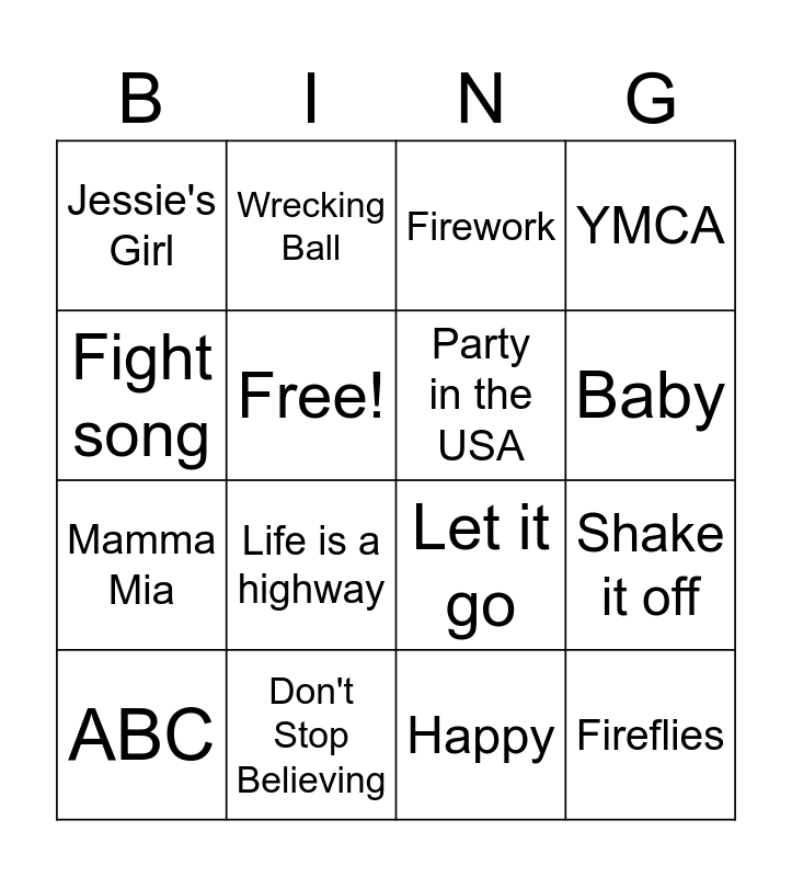 This bingo card has 16 words: Don't Stop Believing, Shake it off, Firework, Jessie's Girl, Mamma Mia, Wrecking Ball, Let it go, Happy, Fight song, Free!, ABC, YMCA, Life is a highway, Baby, Party in the USA and Fireflies.