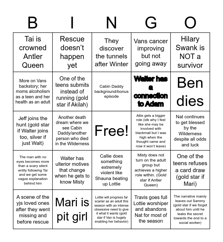 This bingo card has a free space and 24 words: Walter has ulterior motives that change when he gets to know Misty, Mari is pit girl, Cabin Daddy background/bonus episode, A scene of the yjs loved ones after they went missing and before rescue, Hilary Swank is NOT a survivor, Tai is crowned Antler Queen, More on Vans backstory; her moms alcoholism as a teen and her health as an adult, Rescue doesn’t happen yet, Allie gets a bigger role (idk why I feel like she may be involved with blackmail but I was high when the thought came and now it won’t leave), Callie does something extremely violent like Shauna beating up Lottie, Walter has a connection to Adam, Jeff joins the hunt (gold star if Walter joins too, silver if just Walt), Misty does not turn on the adult group but achieves a higher role within. (Gold star if Antler Queen), One of the teens refuses a card draw (gold star if Mari), One of the teens submits instead of running (gold star if Akilah), Travis goes full Lottie worshiper and abandons Nat for most of the season, Nat continues to get blessed by the Wilderness despite all odds and luck, They discover the tunnels after Winter, Ben dies, Another death dream where we see Cabin Daddy/another person who died in the Wilderness, The narrative mainly leaves out Sammy (gold star if we forget about him until he leaks the secret towards the end to a social worker), The man with no eyes becomes more than a scary silent entity following Tai and we get some vague explanation behind him, Vans cancer improving but not going away and Lottie will progress far scarier as an adult this season with an intense obsessive need to give it what it wants (gold star if Van is hugely enabling her behavior).