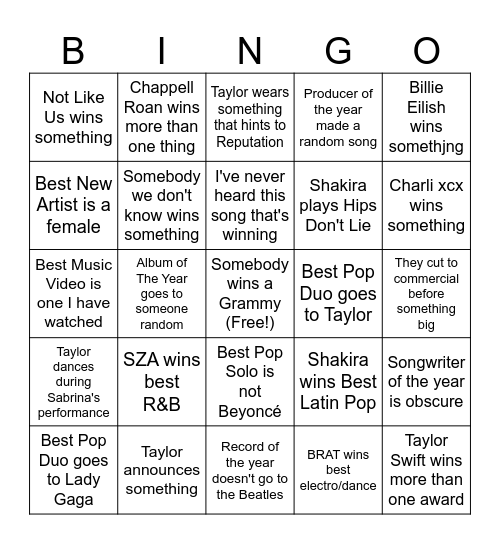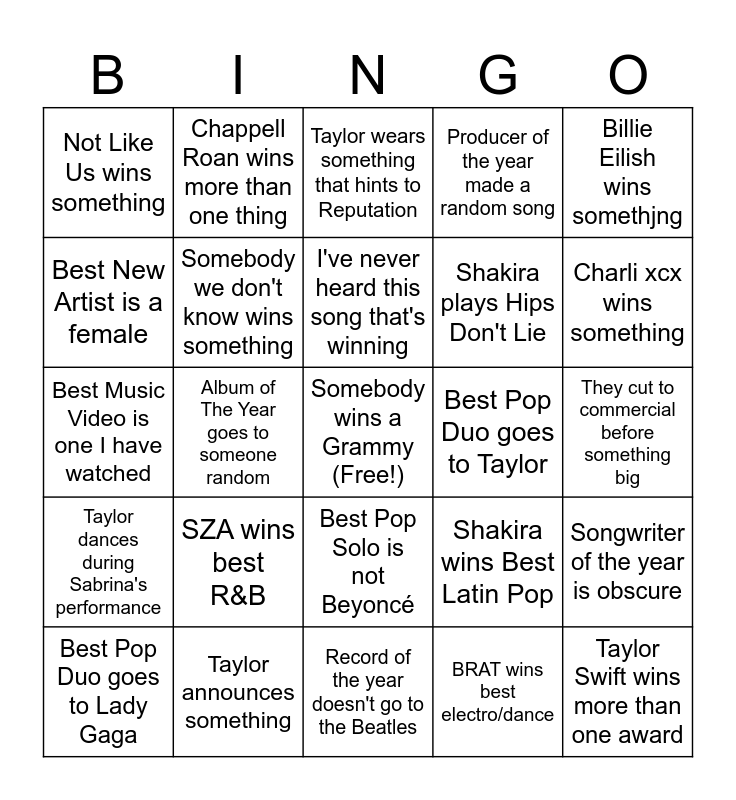This bingo card has a free space and 30 words: Taylor announces something, Chappell Roan wins something, Album of The Year goes to someone random, Sabrina Carpenter plays Esspreso, Not Like Us wins something, Taylor wears something that hints to Reputation, Somebody we don't know wins something, Best Pop Solo is not Beyoncé, Best Pop Duo goes to Taylor, Record of the year doesn't go to the Beatles, They cut to commercial before something big, Taylor Swift wins more than one award, BRAT wins best electro/dance, Taylor thanks Travis Kelce, Charli xcx wins something, Olivia Rodrigo wins best for visual media, Shakira wins Best Latin Pop, Taylor dances during Sabrina's performance, SZA wins best R&B, Billie Eilish wins somethjng, Best Music Video is one I have watched, Beethoven wins something, Chappell Roan wins more than one thing, Shakira plays Hips Don't Lie, Best New Artist is a female, Producer of the year made a random song, Songwriter of the year is obscure, Best Pop Duo goes to Lady Gaga, I've never heard this song that's winning and Record of the Year does go to the Beatles and I'm mad.