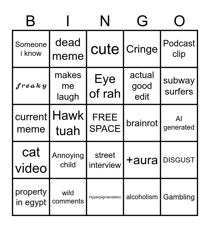 This bingo card has a free space and 24 words: property in egypt, Annoying child, Eye of rah, alcoholism, Podcast clip, Someone i know, dead meme, cute, brainrot, AI generated, current meme, makes me laugh, +aura, DISGUST, 𝓯𝓻𝓮𝓪𝓴𝔂, wild comments, Hyperpigmentation, Cringe, subway surfers, cat video, Hawk tuah, street interview, actual good edit and Gambling.