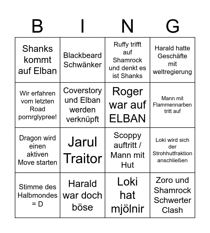 This bingo card has 16 words: Harald war doch böse, Loki wird sich der Strohhutfraktion anschließen, Ruffy trifft auf Shamrock und denkt es ist Shanks, Shanks kommt auf Elban, Dragon wird einen aktiven Move starten, Blackbeard Schwänker, Scoppy auftritt / Mann mit Hut, Loki hat mjölnir, Wir erfahren vom letzten Road pornrglypree!, Coverstory und Elban werden verknüpft, Stimme des Halbmondes = D, Harald hatte Geschäfte mit weltregierung, Jarul Traitor, Mann mit Flammennarben tritt auf, Roger war auf ELBAN and Zoro und Shamrock Schwerter Clash.