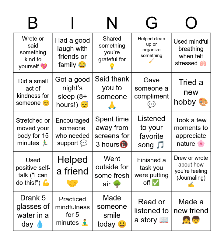 This bingo card has a free space and 24 words: Helped a friend π€, Practiced mindfulness for 5 minutes π§ββοΈ, Said thank you to someone π, Drank 5 glasses of water in a day π§, Used mindful breathing when felt stressed π«, Wrote or said something kind to yourself π, Did a small act of kindness for someone π, Had a good laugh with friends or family π, Listened to your favorite song π΅, Went outside for some fresh air π³, Gave someone a compliment π¬, Stretched or moved your body for 15 minutes πββοΈ, Finished a task you were putting off β , Drew or wrote about how youβre feeling (Journaling)β, Got a good nightβs sleep (8+ hours!) π΄, Read or listened to a story π, Took a few moments to appreciate nature πΈ, Shared something youβre grateful for π‘, Tried a new hobby π¨, Encouraged someone who needed support π¬, Made a new friend π§π¦, Used positive self-talk ("I can do this!") πͺ, Helped clean up or organize something π§Ή and Made someone smile today π.