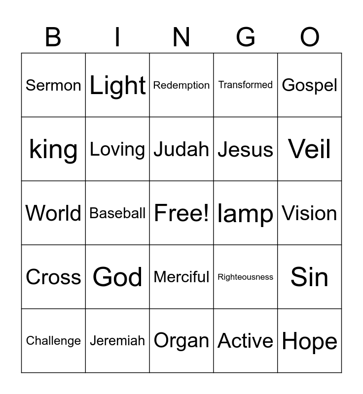 This bingo card has a free space and 24 words: God, Jeremiah, Judah, Challenge, Gospel, Sermon, king, Light, lamp, Merciful, Jesus, World, Righteousness, Sin, Loving, Active, Vision, Redemption, Veil, Baseball, Hope, Cross, Transformed and Organ.