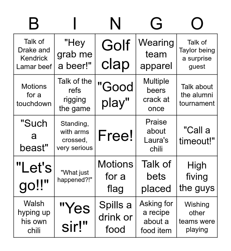This bingo card has a free space and 24 words: "What just happened?!", "Yes sir!", "Good play", Walsh hyping up his own chili, Talk of Taylor being a surprise guest, Talk of Drake and Kendrick Lamar beef, Motions for a touchdown, "Hey grab me a beer!", Praise about Laura's chili, Motions for a flag, Multiple beers crack at once, "Such a beast", Talk of bets placed, High fiving the guys, Talk of the refs rigging the game, Asking for a recipe about a food item, "Call a timeout!", Golf clap, Talk about the alumni tournament, Standing, with arms crossed, very serious, Wishing other teams were playing, "Let's go!!", Wearing team apparel and Spills a drink or food.