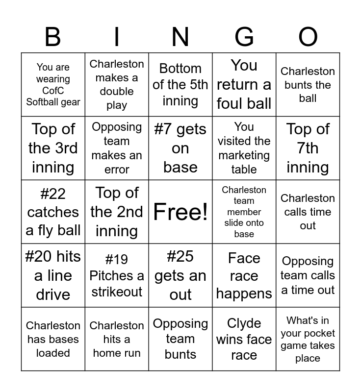 This bingo card has a free space and 24 words: #19 Pitches a strikeout, Charleston hits a home run, #7 gets on base, Charleston has bases loaded, Charleston bunts the ball, You are wearing CofC Softball gear, Top of the 3rd inning, Charleston makes a double play, Charleston team member slide onto base, #25 gets an out, You visited the marketing table, #22 catches a fly ball, Face race happens, Opposing team calls a time out, Opposing team makes an error, Clyde wins face race, Charleston calls time out, Bottom of the 5th inning, Top of 7th inning, Top of the 2nd inning, What's in your pocket game takes place, #20 hits a line drive, You return a foul ball and Opposing team bunts.