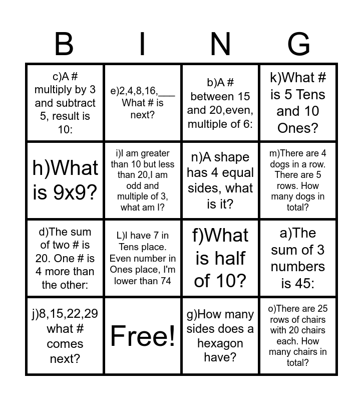 This bingo card has 16 words: Free!, a)The sum of 3 numbers is 45:, b)A # between 15 and 20,even, multiple of 6:, c)A # multiply by 3 and subtract 5, result is 10:, d)The sum of two # is 20. One # is 4 more than the other:, e)2,4,8,16,___ What # is next?, f)What is half of 10?, g)How many sides does a hexagon have?, h)What is 9x9?, i)I am greater than 10 but less than 20,I am odd and multiple of 3, what am I?, j)8,15,22,29 what # comes next?, k)What # is 5 Tens and 10 Ones?, L)I have 7 in Tens place. Even number in Ones place, I'm lower than 74, m)There are 4 dogs in a row. There are 5 rows. How many dogs in total?, n)A shape has 4 equal sides, what is it? and o)There are 25 rows of chairs with 20 chairs each. How many chairs in total?.
