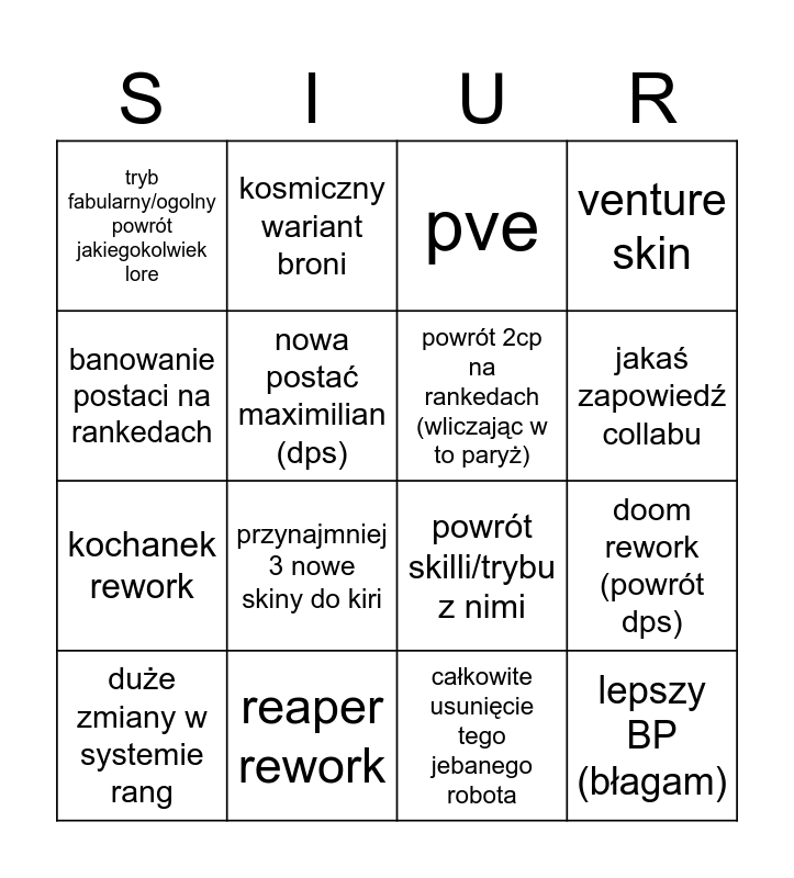 This bingo card has 16 words: reaper rework, doom rework (powrót dps), pve, tryb fabularny/ogolny powrót jakiegokolwiek lore, kochanek rework, kosmiczny wariant broni, powrót skilli/trybu z nimi, całkowite usunięcie tego jebanego robota, banowanie postaci na rankedach, nowa postać maximilian (dps), duże zmiany w systemie rang, venture skin, przynajmniej 3 nowe skiny do kiri, jakaś zapowiedź collabu, powrót 2cp na rankedach (wliczając w to paryż) and lepszy BP (błagam).