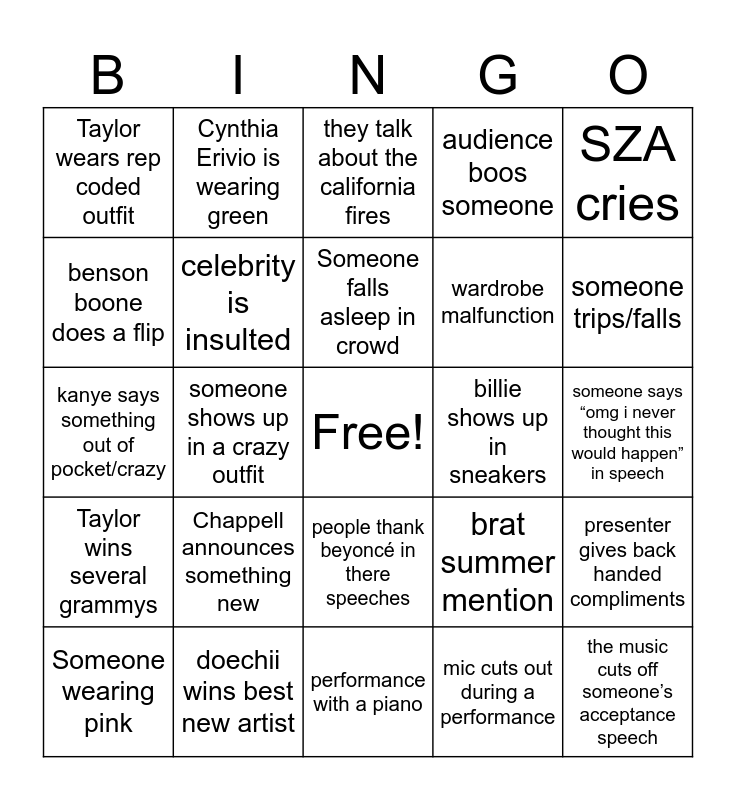 This bingo card has a free space and 24 words: Chappell announces something new, doechii wins best new artist, Someone falls asleep in crowd, Someone wearing pink, SZA cries, Taylor wears rep coded outfit, benson boone does a flip, Cynthia Erivio is wearing green, billie shows up in sneakers, people thank beyoncé in there speeches, wardrobe malfunction, kanye says something out of pocket/crazy, brat summer mention, presenter gives back handed compliments, celebrity is insulted, mic cuts out during a performance, someone says “omg i never thought this would happen” in speech, they talk about the california fires, someone trips/falls, someone shows up in a crazy outfit, the music cuts off someone’s acceptance speech, Taylor wins several grammys, audience boos someone and performance with a piano.