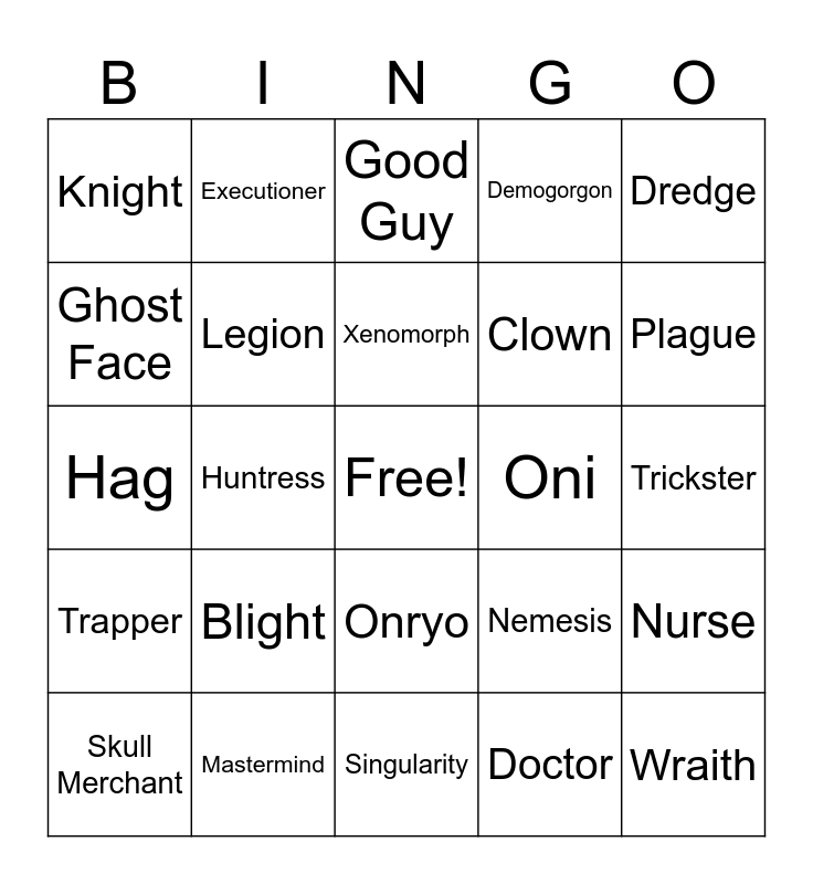 This bingo card has a free space and 24 words: Blight, Mastermind, Xenomorph, Skull Merchant, Dredge, Knight, Ghost Face, Executioner, Oni, Onryo, Clown, Hag, Nemesis, Nurse, Legion, Doctor, Trickster, Good Guy, Plague, Huntress, Wraith, Trapper, Demogorgon and Singularity.