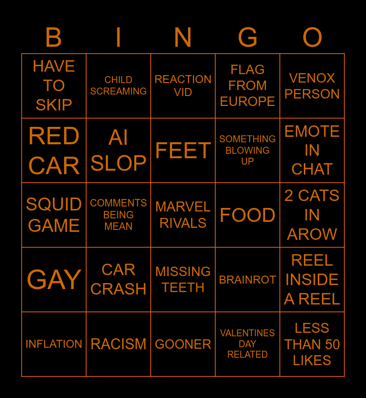 This bingo card has a free space and 24 words: CAR CRASH, RACISM, FEET, INFLATION, VENOX PERSON, HAVE TO SKIP, RED CAR, CHILD SCREAMING, FOOD, MISSING TEETH, SOMETHING BLOWING UP, SQUID GAME, BRAINROT, REEL INSIDE A REEL, AI SLOP, VALENTINES DAY RELATED, 2 CATS IN AROW, REACTION VID, EMOTE IN CHAT, COMMENTS BEING MEAN, LESS THAN 50 LIKES, GAY, FLAG FROM EUROPE and GOONER.