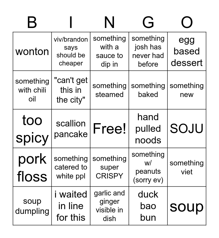 This bingo card has a free space and 29 words: soup dumpling, eaten off a stick/skewer, scallion pancake, pork centered, wonton, something with a sauce to dip in, "can't get this in the city", something catered to white ppl, hand pulled noods, i waited in line for this, SOJU, soup, garlic and ginger visible in dish, duck bao bun, something new, something dunked in a soy-based sauce, something super CRISPY, pork floss, egg based dessert, too spicy, something w/ peanuts (sorry ev), boba, something baked, something with chili oil, something josh has never had before, viv/brandon says should be cheaper, something viet, something steamed and veggie only dish.