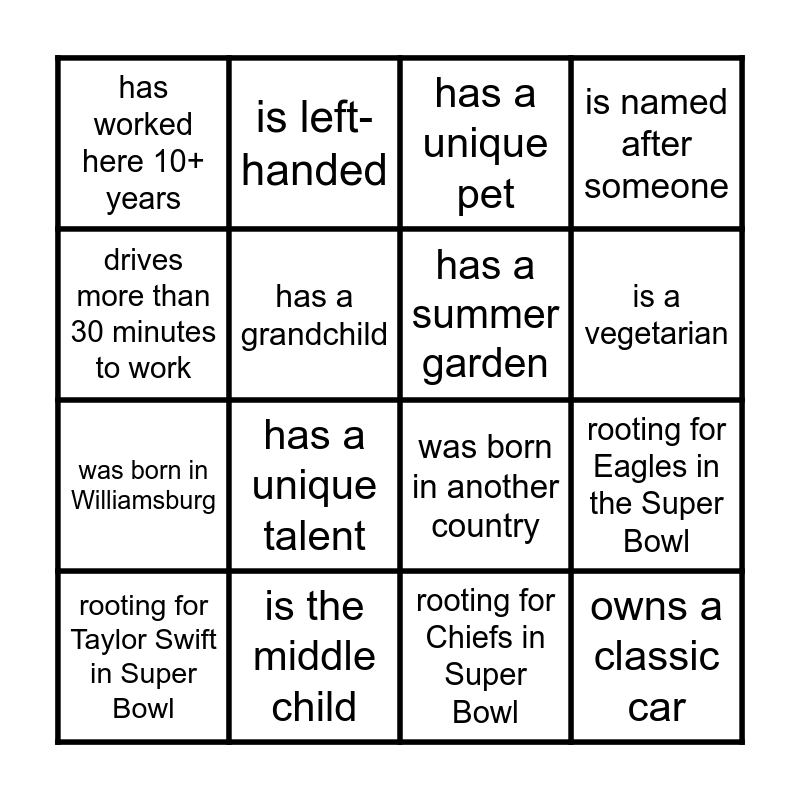 This bingo card has 16 words: is the middle child, rooting for Eagles in the Super Bowl, has a unique pet, has worked here 10+ years, was born in Williamsburg, is left-handed, was born in another country, rooting for Chiefs in Super Bowl, drives more than 30 minutes to work, has a grandchild, rooting for Taylor Swift in Super Bowl, is named after someone, has a unique talent, is a vegetarian, has a summer garden and owns a classic car.
