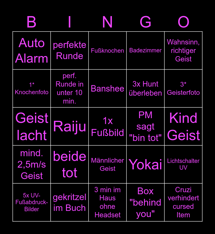 This bingo card has a free space and 24 words: beide tot, gekritzel im Buch, Banshee, 5x UV-Fußabdruck-Bilder, Wahnsinn, richtiger Geist, Auto Alarm, 1* Knochenfoto, perfekte Runde, PM sagt "bin tot", Männlicher Geist, 3x Hunt überleben, Geist lacht, Yokai, Lichtschalter UV, perf. Runde in unter 10 min., Box "behind you", Kind Geist, Fußknochen, 3* Geisterfoto, Raiju, Cruzi verhindert cursed Item, mind. 2,5m/s Geist, Badezimmer and 3 min im Haus ohne Headset.