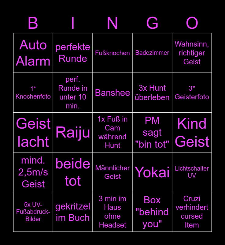 This bingo card has a free space and 24 words: beide tot, gekritzel im Buch, Banshee, 5x UV-Fußabdruck-Bilder, Wahnsinn, richtiger Geist, Auto Alarm, 1* Knochenfoto, perfekte Runde, PM sagt "bin tot", Männlicher Geist, 3x Hunt überleben, Geist lacht, Yokai, Lichtschalter UV, perf. Runde in unter 10 min., Box "behind you", Kind Geist, Fußknochen, 3* Geisterfoto, Raiju, Cruzi verhindert cursed Item, mind. 2,5m/s Geist, Badezimmer and 3 min im Haus ohne Headset.