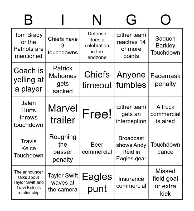 This bingo card has a free space and 40 words: Patrick Mahomes throws touchdown, Jalen Hurts throws touchdown, Jalen Hurts gets sacked, Patrick Mahomes gets sacked, Taylor Swift waves at the camera, Beer commercial, Chiefs timeout, Eagles timeout, Saquon Barkley Touchdown, Travis Kelce Touchdown, Marvel trailer, Either team reaches 14 or more points, Missed field goal or extra kick, A truck commercial is aired, Either team gets an interception, Roughing the passer penalty, Camera cuts to a fan drinking beer, Tom Brady or the Patriots are mentioned, Players do a chest bump, Defense does a celebration in the endzone, Touchdown dance, Insurance commercial, Anyone fumbles, Coach is yelling at a player, Close up of Andy Reid’s face, Camera shows Chiefs fans doing the Tomahawk chant, Saquon Barkley 20+ yard run, Devonta Smith touchdown, False start, Holding penalty, Nick Sirianni touches his headset, The announcer talks about Taylor Swift and Travi Kelce’s relationship, Either coach throws a challenge flag, Broadcast shows Andy Reid in Eagles gear, Facemask penalty, Eagles punt, Chiefs punt, Soda commercial, Chiefs have 3 touchdowns and Eagles reach 20 points.