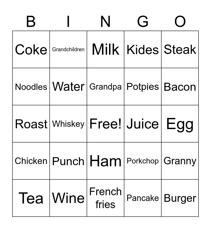 This bingo card has a free space and 29 words: Tea, Coffee, Whiskey, Beer, Coke, Milk, Water, Punch, Juice, Wine, Egg, Burger, French fries, Pancake, Bacon, Sauage, Ham, Chicken, Steak, Roast, Porkchop, Hotdog, Potpies, Noodles, Kides, Grandchildren, Granny, Grandpa and Friends.