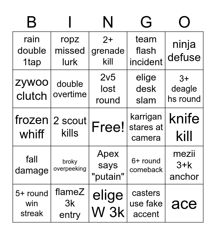 This bingo card has a free space and 24 words: broky overpeeking, flameZ 3k entry, 2v5 lost round, 5+ round win streak, ninja defuse, rain double 1tap, zywoo clutch, ropz missed lurk, karrigan stares at camera, Apex says "putain", elige desk slam, frozen whiff, 6+ round comeback, mezii 3+k anchor, double overtime, casters use fake accent, knife kill, 2+ grenade kill, 3+ deagle hs round, 2 scout kills, ace, fall damage, team flash incident and elige W 3k.