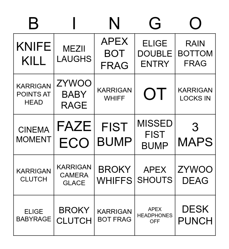 This bingo card has a free space and 24 words: KARRIGAN CAMERA GLACE, BROKY CLUTCH, KARRIGAN WHIFF, ELIGE BABYRAGE, RAIN BOTTOM FRAG, KNIFE KILL, KARRIGAN POINTS AT HEAD, MEZII LAUGHS, MISSED FIST BUMP, BROKY WHIFFS, OT, CINEMA MOMENT, APEX SHOUTS, ZYWOO DEAG, ZYWOO BABY RAGE, APEX HEADPHONES OFF, 3 MAPS, APEX BOT FRAG, KARRIGAN LOCKS IN, FAZE ECO, DESK PUNCH, KARRIGAN CLUTCH, ELIGE DOUBLE ENTRY and KARRIGAN BOT FRAG.