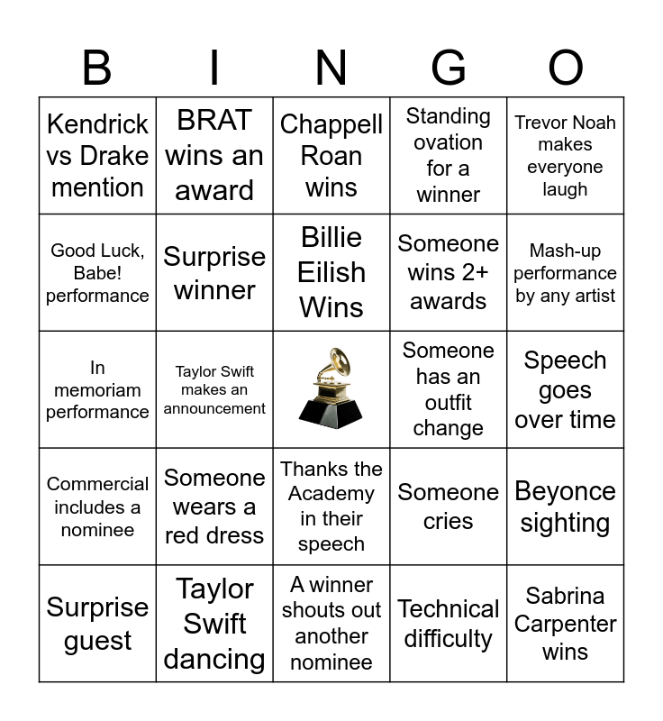 This bingo card has a free space and 24 words: Someone wears a red dress, Taylor Swift dancing, Billie Eilish Wins, Surprise guest, Trevor Noah makes everyone laugh, Kendrick vs Drake mention, Good Luck, Babe! performance, BRAT wins an award, Someone has an outfit change, Thanks the Academy in their speech, Someone wins 2+ awards, In memoriam performance, Someone cries, Beyonce sighting, Surprise winner, Technical difficulty, Speech goes over time, Chappell Roan wins, Mash-up performance by any artist, Taylor Swift makes an announcement, Sabrina Carpenter wins, Commercial includes a nominee, Standing ovation for a winner and A winner shouts out another nominee.
