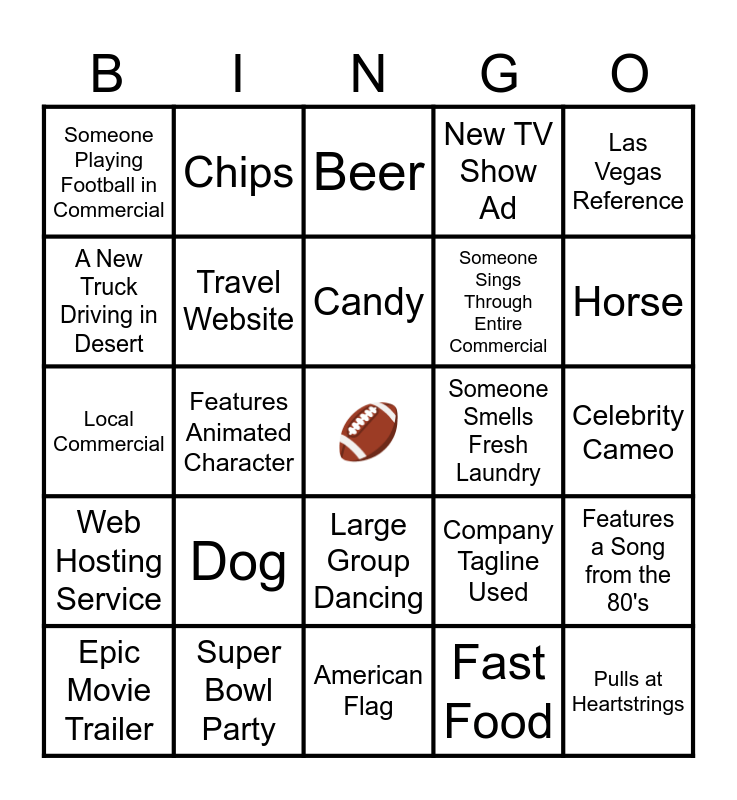 This bingo card has a free space and 24 words: Dog, Super Bowl Party, Candy, Epic Movie Trailer, Las Vegas Reference, Someone Playing Football in Commercial, A New Truck Driving in Desert, Chips, Someone Smells Fresh Laundry, Large Group Dancing, Someone Sings Through Entire Commercial, Local Commercial, Company Tagline Used, Features a Song from the 80's, Travel Website, Fast Food, Celebrity Cameo, Beer, Horse, Features Animated Character, Pulls at Heartstrings, Web Hosting Service, New TV Show Ad and American Flag.