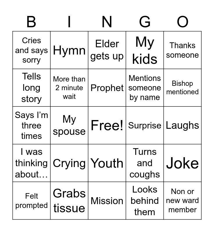 This bingo card has a free space and 24 words: Crying, Grabs tissue, Prophet, Felt prompted, Thanks someone, Cries and says sorry, Tells long story, Hymn, Surprise, Youth, Mentions someone by name, Says I’m three times, Turns and coughs, Joke, More than 2 minute wait, Looks behind them, Laughs, Elder gets up, Bishop mentioned, My spouse, Non or new ward member, I was thinking about…, My kids and Mission.