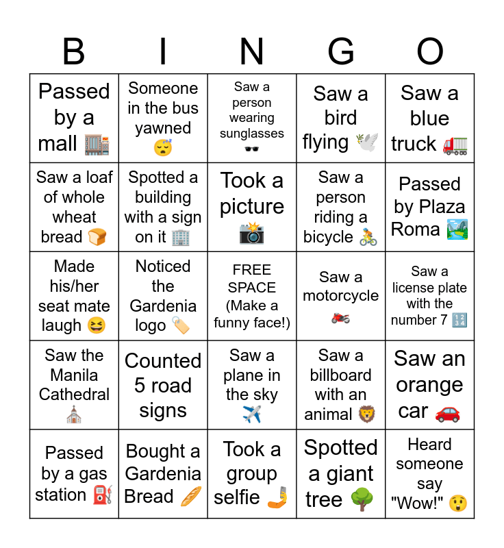 This bingo card has a free space and 24 words: Counted 5 road signs, Bought a Gardenia Bread 🥖, Took a picture 📸, Passed by a gas station ⛽, Saw a blue truck 🚛, Passed by a mall 🏬, Saw a loaf of whole wheat bread 🍞, Someone in the bus yawned 😴, Saw a motorcycle 🏍️, Saw a plane in the sky ✈️, Saw a person riding a bicycle 🚴, Made his/her seat mate laugh 😆, Saw a billboard with an animal 🦁, Saw an orange car 🚗, Spotted a building with a sign on it 🏢, Spotted a giant tree 🌳, Saw a license plate with the number 7 🔢, Saw a person wearing sunglasses 🕶️, Passed by Plaza Roma 🏞️, Noticed the Gardenia logo 🏷️, Heard someone say "Wow!" 😲, Saw the Manila Cathedral ⛪, Saw a bird flying 🕊️ and Took a group selfie 🤳.