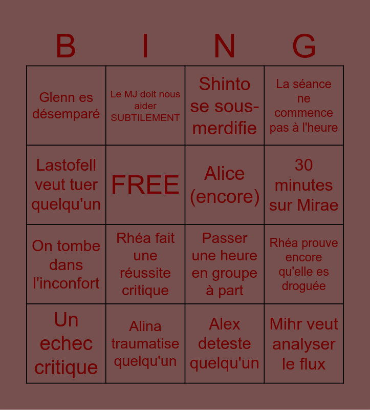 This bingo card has 16 words: Alina traumatise quelqu'un, Rhéa prouve encore qu'elle es droguée, Shinto se sous-merdifie, Glenn es désemparé, On tombe dans l'inconfort, Le MJ doit nous aider SUBTILEMENT, Passer une heure en groupe à part, Alex deteste quelqu'un, Lastofell veut tuer quelqu'un, FREE, Un echec critique, La séance ne commence pas à l'heure, Rhéa fait une réussite critique, 30 minutes sur Mirae, Alice (encore) and Mihr veut analyser le flux.