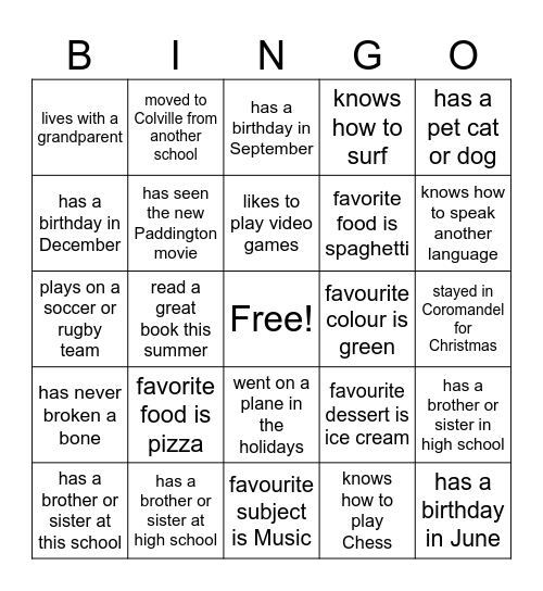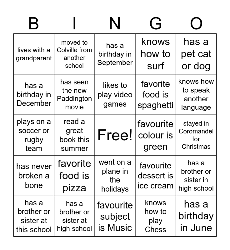 This bingo card has a free space and 24 words: has a brother or sister at this school, favorite food is pizza, likes to play video games, knows how to play Chess, has a pet cat or dog, lives with a grandparent, moved to Colville from another school, has a birthday in September, favourite colour is green, stayed in Coromandel for Christmas, plays on a soccer or rugby team, has seen the new Paddington movie, favourite dessert is ice cream, has a brother or sister in high school, has a birthday in December, has a brother or sister at high school, favourite subject is Music, knows how to surf, knows how to speak another language, has never broken a bone, read a great book this summer, went on a plane in the holidays, favorite food is spaghetti and has a birthday in June.