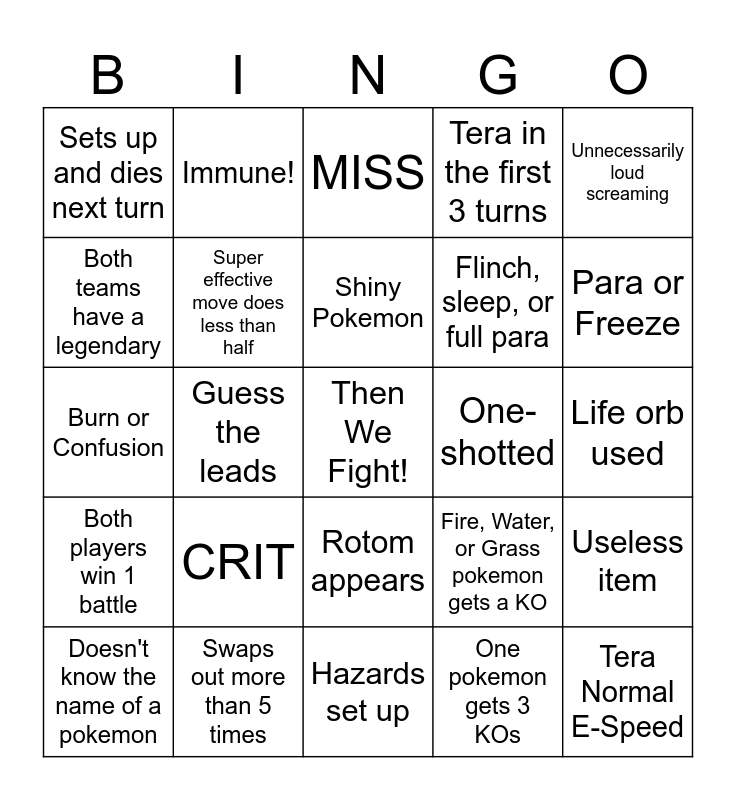 This bingo card has a free space and 24 words: CRIT, Swaps out more than 5 times, Shiny Pokemon, Doesn't know the name of a pokemon, Unnecessarily loud screaming, Sets up and dies next turn, Both teams have a legendary, Immune!, One-shotted, Rotom appears, Flinch, sleep, or full para, Burn or Confusion, Fire, Water, or Grass pokemon gets a KO, Useless item, Super effective move does less than half, One pokemon gets 3 KOs, Life orb used, MISS, Para or Freeze, Guess the leads, Tera Normal E-Speed, Both players win 1 battle, Tera in the first 3 turns and Hazards set up.