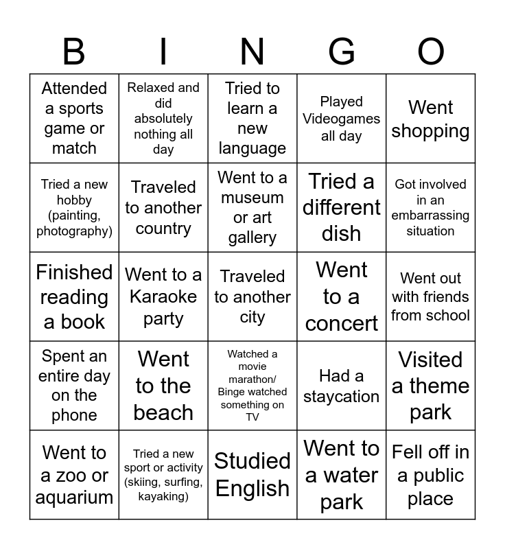 This bingo card has a free space and 24 words: Went to the beach, Tried a new sport or activity (skiing, surfing, kayaking), Went to a museum or art gallery, Went to a zoo or aquarium, Went shopping, Attended a sports game or match, Tried a new hobby (painting, photography), Relaxed and did absolutely nothing all day, Went to a concert, Watched a movie marathon/ Binge watched something on TV, Tried a different dish, Finished reading a book, Had a staycation, Visited a theme park, Traveled to another country, Went to a water park, Went out with friends from school, Tried to learn a new language, Got involved in an embarrassing situation, Went to a Karaoke party, Fell off in a public place, Spent an entire day on the phone, Played Videogames all day and Studied English.