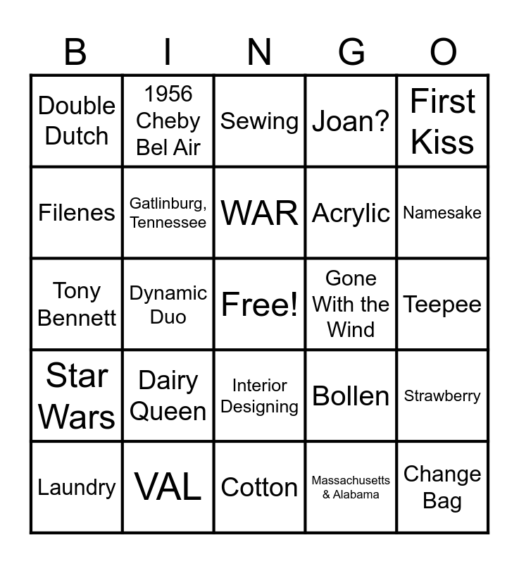 This bingo card has a free space and 24 words: Dairy Queen, VAL, WAR, Laundry, First Kiss, Double Dutch, Filenes, 1956 Cheby Bel Air, Gone With the Wind, Interior Designing, Acrylic, Tony Bennett, Bollen, Strawberry, Gatlinburg, Tennessee, Massachusetts & Alabama, Teepee, Sewing, Namesake, Dynamic Duo, Change Bag, Star Wars, Joan? and Cotton.