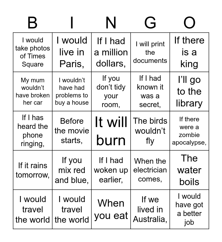 This bingo card has a free space and 24 words: If you mix red and blue,, I would travel the world, If you don’t tidy your room,, I would travel the world, If there is a king, I would take photos of Times Square, My mum wouldn’t have broken her car, I would live in Paris,, The birds wouldn’t fly, If I had woken up earlier,, If I had known it was a secret,, If I has heard the phone ringing,, When the electrician comes,, The water boils, I wouldn’t have had problems to buy a house, If we lived in Australia,, If there were a zombie apocalypse,, If I had a million dollars,, I’ll go to the library, Before the movie starts,, I would have got a better job, If it rains tomorrow,, I will print the documents and When you eat.