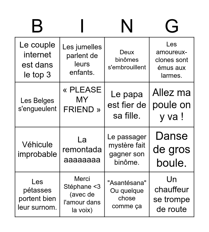 This bingo card has 16 words: Les pétasses portent bien leur surnom., Merci Stéphane <3 (avec de l'amour dans la voix), Deux binômes s'embrouillent, Les amoureux-clones sont émus aux larmes., Les Belges s'engueulent, Les jumelles parlent de leurs enfants., Le passager mystère fait gagner son binôme., Danse de gros boule., Le couple internet est dans le top 3, « PLEASE MY FRIEND », "Asantésana" Ou quelque chose comme ça, Allez ma poule on y va !, Véhicule improbable, La remontada aaaaaaaa, Le papa est fier de sa fille. and Un chauffeur se trompe de route.