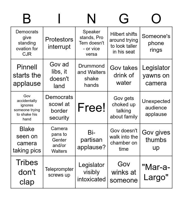 This bingo card has a free space and 29 words: Tribes don't clap, Gov strokes his beard, Democrats scowl at border security, Standing ovation for First Lady, Democrats give standing ovation for CJR, Speaker stands, Pro Tem doesn't - or vice versa, Gov ad libs, it doesn't land, Camera pans to Genter and/or Walters, Gov gets choked up talking about family, Teleprompter screws up, Unexpected audience applause, "Mar-a-Largo", Legislator visibly intoxicated, Gov winks at someone, Legislator yawns on camera, Aggressive head nodding from Pinnell, Bi-partisan applause?, Blake seen on camera taking pics, Someone's phone rings, Gov accidentally ignores someone trying to shake his hand, Gov doesn't walk into the chamber on time, Legislator shouts something random, Gov takes drink of water, Pinnell starts the applause, Hilbert shifts around trying to look taller in his seat, Protestors interrupt, Gov gives thumbs up, Drummond and Walters shake hands and Legislator looks around to see if they have to stand.