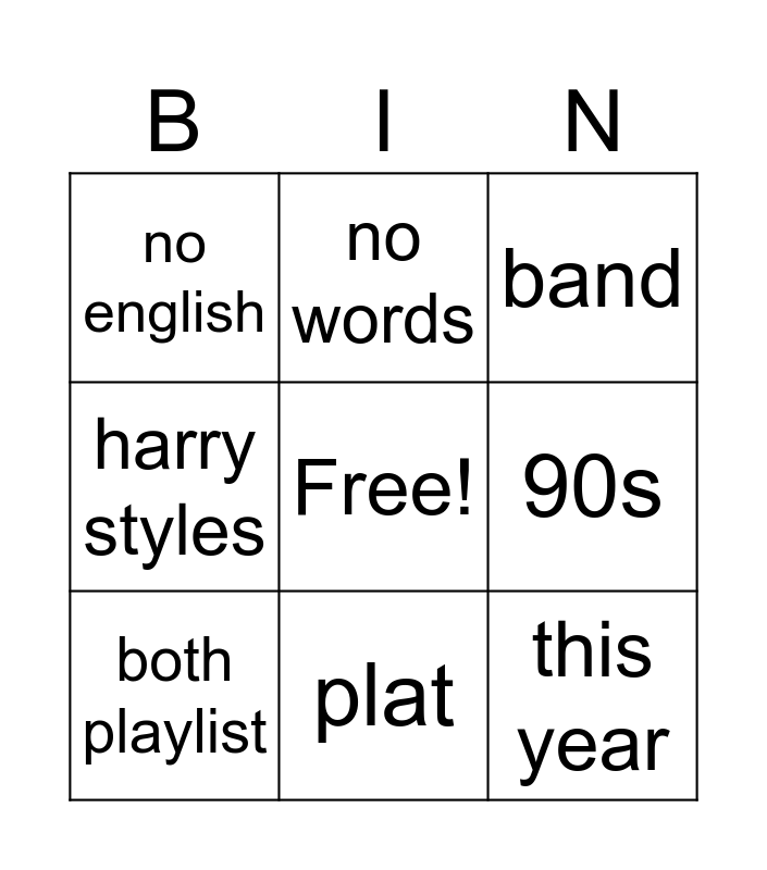 This bingo card has a free space and 8 words: 90s, band, no words, both playlist, no english, this year, harry styles and plat.