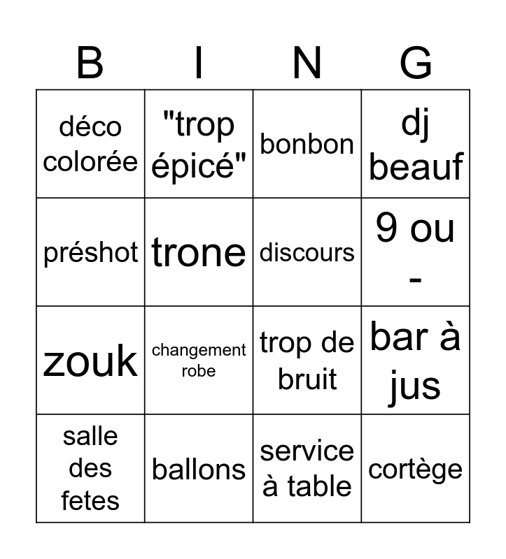 This bingo card has 16 words: ballons, bar à jus, bonbon, déco colorée, zouk, "trop épicé", trop de bruit, service à table, préshot, trone, salle des fetes, dj beauf, changement robe, 9 ou -, discours and cortège.