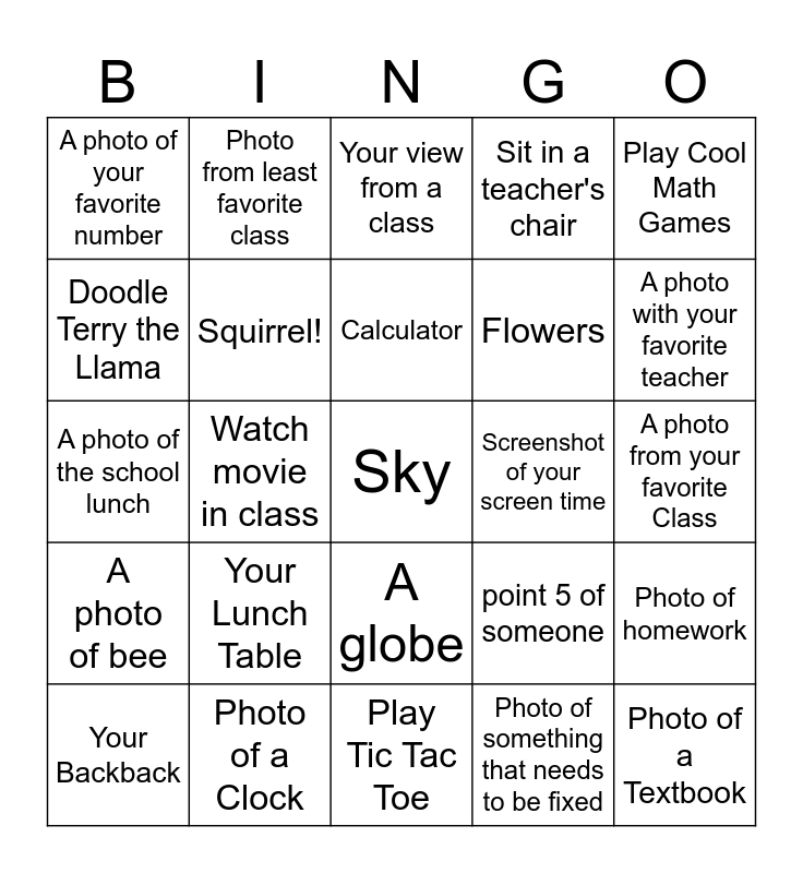 This bingo card has a free space and 24 words: Your Lunch Table, Photo of a Clock, Calculator, Your Backback, Play Cool Math Games, A photo of your favorite number, Doodle Terry the Llama, Photo from least favorite class, Screenshot of your screen time, A globe, Flowers, A photo of the school lunch, point 5 of someone, Photo of homework, Squirrel!, Photo of something that needs to be fixed, A photo from your favorite Class, Your view from a class, A photo with your favorite teacher, Watch movie in class, Photo of a Textbook, A photo of bee, Sit in a teacher's chair and Play Tic Tac Toe.