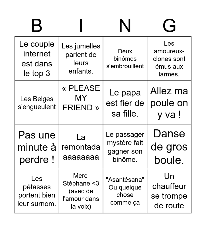 This bingo card has 16 words: Les pétasses portent bien leur surnom., Merci Stéphane <3 (avec de l'amour dans la voix), Deux binômes s'embrouillent, Les amoureux-clones sont émus aux larmes., Les Belges s'engueulent, Les jumelles parlent de leurs enfants., Le passager mystère fait gagner son binôme., Danse de gros boule., Le couple internet est dans le top 3, « PLEASE MY FRIEND », "Asantésana" Ou quelque chose comme ça, Allez ma poule on y va !, Pas une minute à perdre !, La remontada aaaaaaaa, Le papa est fier de sa fille. and Un chauffeur se trompe de route.