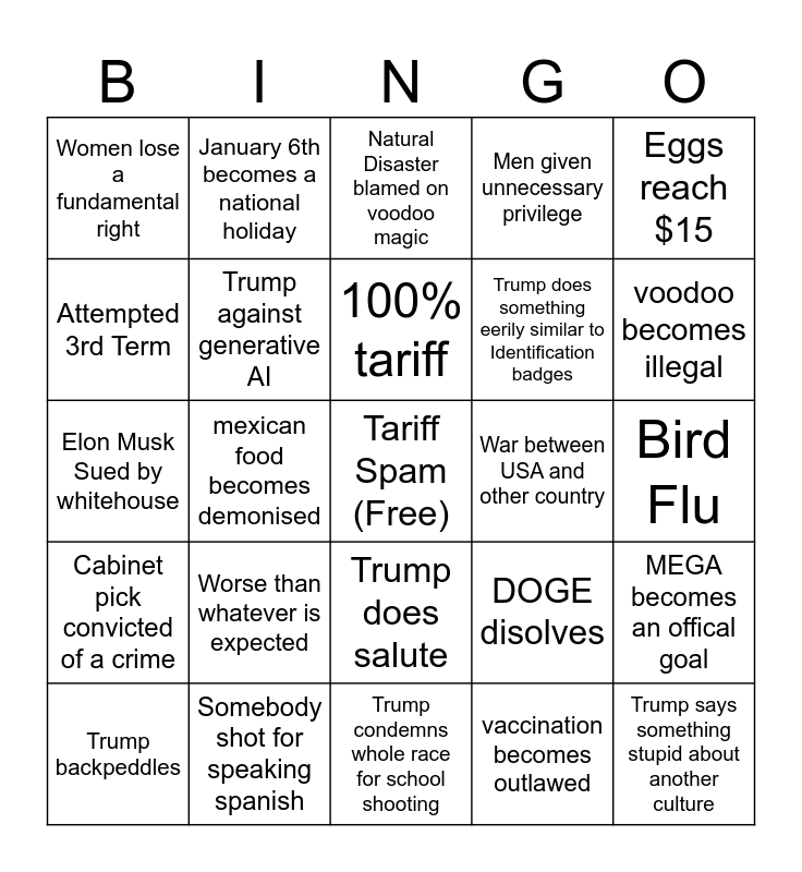This bingo card has a free space and 24 words: Worse than whatever is expected, Somebody shot for speaking spanish, 100% tariff, Trump backpeddles, Eggs reach $15, Women lose a fundamental right, Attempted 3rd Term, January 6th becomes a national holiday, War between USA and other country, Trump does salute, Trump does something eerily similar to Identification badges, Elon Musk Sued by whitehouse, DOGE disolves, MEGA becomes an offical goal, Trump against generative AI, vaccination becomes outlawed, Bird Flu, Natural Disaster blamed on voodoo magic, voodoo becomes illegal, mexican food becomes demonised, Trump says something stupid about another culture, Cabinet pick convicted of a crime, Men given unnecessary privilege and Trump condemns whole race for school shooting.