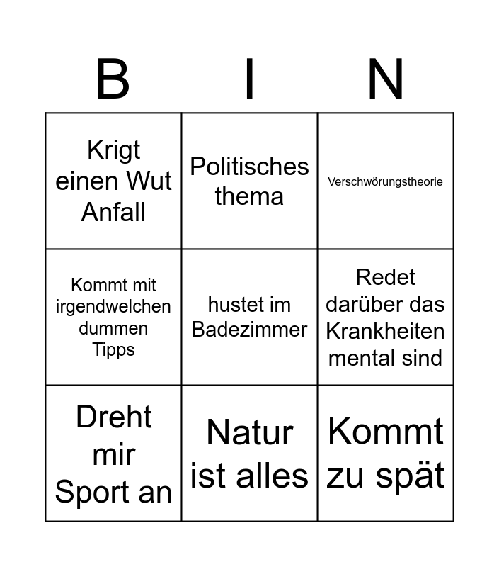 This bingo card has a free space and 8 words: Redet darüber das Krankheiten mental sind, Verschwörungstheorie, Politisches thema, Dreht mir Sport an, Krigt einen Wut Anfall, Kommt zu spät, Kommt mit irgendwelchen dummen Tipps and Natur ist alles.