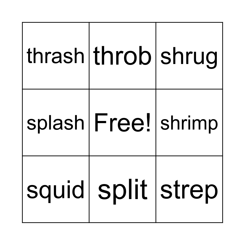 This bingo card has a free space and 17 words: shrub, scream, shrug, thrash, thrill, splash, string, squid, split, shrimp, screen, scratch, strep, throb, strut, street and spring.
