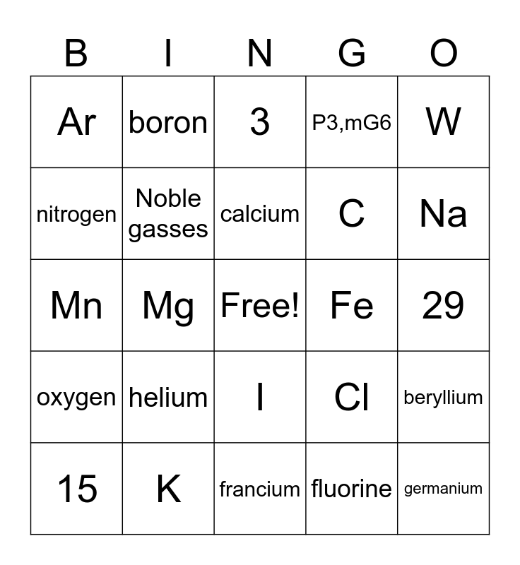 This bingo card has a free space and 29 words: 15, aluminium, Mg, titanium, Ar, 3, Noble gasses, helium, Fe, K, 29, germanium, francium, fluorine, Na, silver, I, oxygen, W, Mn, Cl, barium, C, nitrogen, P3,mG6, boron, beryllium, calcium and Si.