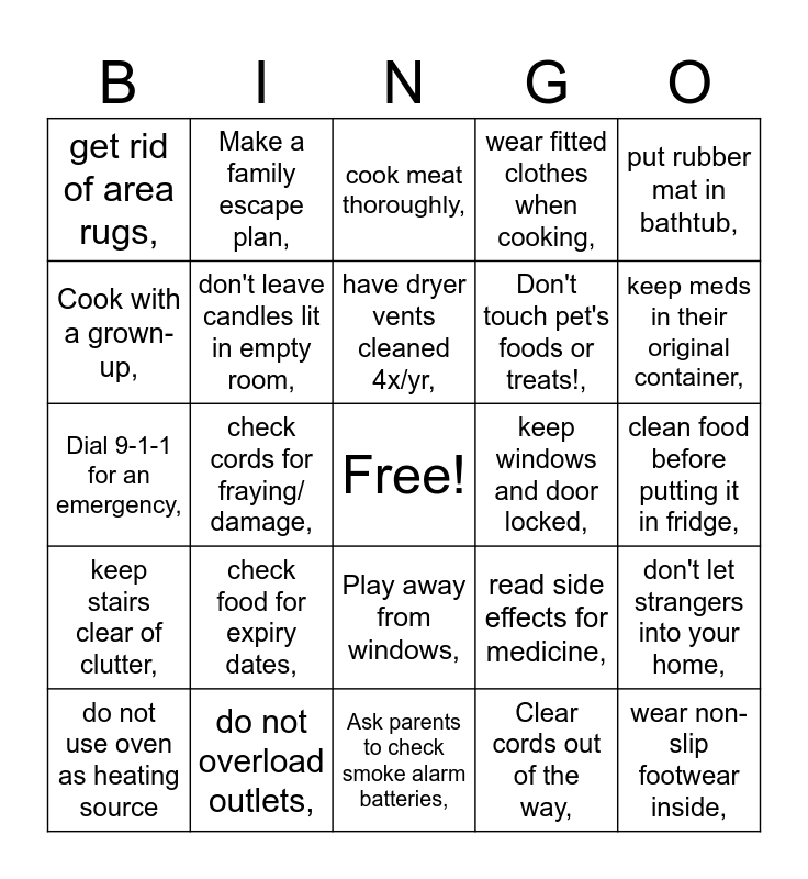 This bingo card has a free space and 36 words: use a night light,, place a lamp next to your bed,, wear proper fitting shoes,, don't leave candles lit in empty room,, read side effects for medicine,, keep stairs clear of clutter,, have dryer vents cleaned 4x/yr,, use handrails on stairs,, put rubber mat in bathtub,, keep emergency numbers handy,, check cords for fraying/ damage,, wear fitted clothes when cooking,, use reacher to reach up high,, keep windows and door locked,, keep meds in their original container,, get rid of area rugs,, cover sharp furniture edges,, check food for expiry dates,, wear non-slip footwear inside,, cook meat thoroughly,, clean food before putting it in fridge,, don't let strangers into your home,, do not overload outlets,, do not use oven as heating source, Ask parents to check smoke alarm batteries,, Make a family escape plan,, Dial 9-1-1 for an emergency,, Don't climb - ask a grownup,, Don't touch pet's foods or treats!,, Cook with a grown-up,, HOT! Stay away from fires and hot surfaces,, Put toys away,, Clear cords out of the way,, Play away from windows,, Keep walkwaysclear and Chew before you swallow..