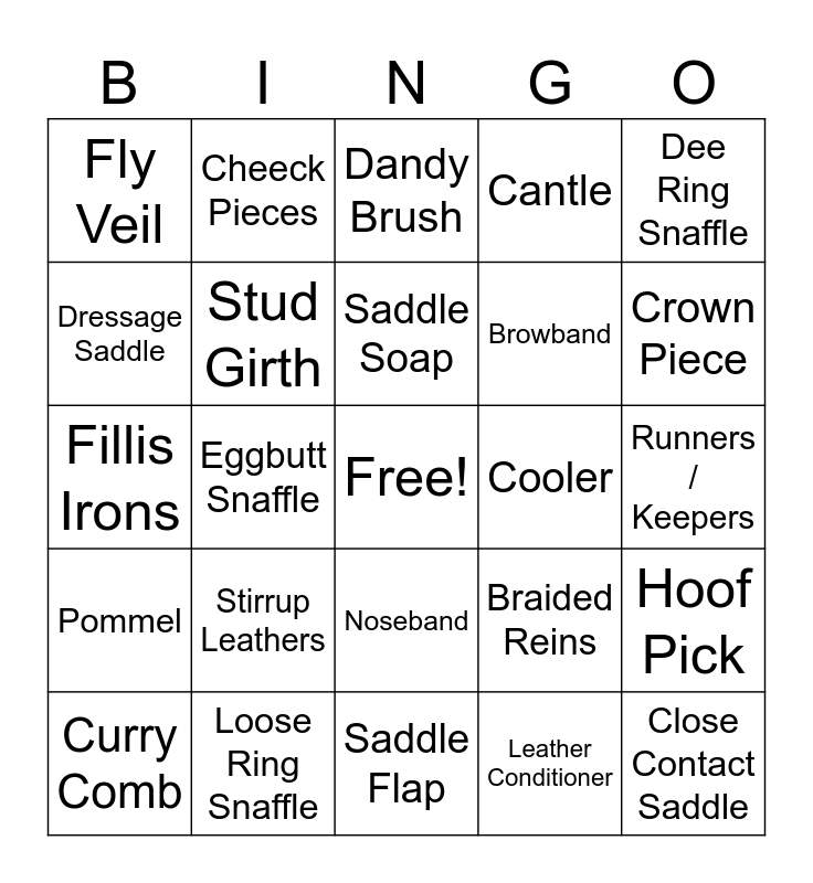 This bingo card has a free space and 24 words: Stirrup Leathers, Loose Ring Snaffle, Saddle Soap, Curry Comb, Dee Ring Snaffle, Fly Veil, Dressage Saddle, Cheeck Pieces, Cooler, Noseband, Browband, Fillis Irons, Braided Reins, Hoof Pick, Stud Girth, Leather Conditioner, Runners / Keepers, Dandy Brush, Crown Piece, Eggbutt Snaffle, Close Contact Saddle, Pommel, Cantle and Saddle Flap.