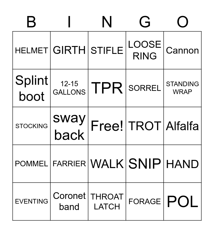 This bingo card has a free space and 24 words: FARRIER, Coronet band, TPR, EVENTING, Cannon, HELMET, Splint boot, GIRTH, TROT, WALK, SORREL, STOCKING, SNIP, HAND, 12-15 GALLONS, FORAGE, Alfalfa, STIFLE, STANDING WRAP, sway back, POL, POMMEL, LOOSE RING and THROAT LATCH.